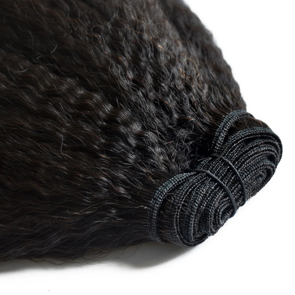 La texture crépue passée au fer à lisser, donne notre magnifique texture défrisée. Les mèches ne reprennent leur texture qu'après un shampoing.